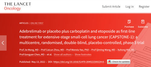 北京时间2022年5月14日,AG亚游医药自主研发的PD-L1抑制剂阿得贝利单抗治疗广泛期小细胞肺癌的III期临床研究(CAPSTONE-1研究)成果正式全文在线发表于国际权威学术期刊《柳叶刀·肿瘤学》(《THE LANCET Oncology》,影响因子41.316)。CAPSTONE-1研究结果显示,阿得贝利单抗联合化疗一线治疗广泛期小细胞肺癌相较于安慰剂联合化疗可以显著延长患者总生存期至15.3个月[1],刷新现有免疫药物一线治疗广泛期小细胞肺癌的总生存纪录[2]